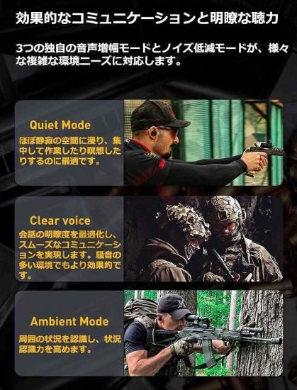 *機能は射撃時の音量カットではなく減音となります。射撃時の周囲音量を維持することで周囲の状況を把握し易くする製品です。